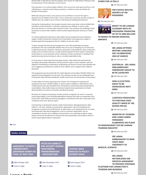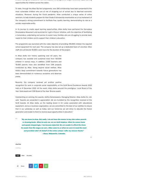 To-date, through the Atlas Sip Savi programme, over 200 scholarships have been presented to the most vulnerable children who are at risk of dropping out of school due to deprived economic situations. Moreover, during the Covid pandemic, Atlas conducted a unique series of online seminars, to help students prepare for their Grade 5 Scholarship examination as a true testament of the company’s strong commitment to facilitate free, quality learning, demonstrating its role as a socially responsible entity.