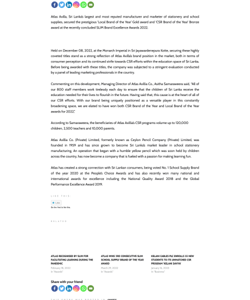 Commenting on winning the awards, Asitha Samaraweera, Managing Director, Atlas Axillia Co. Ltd. said, “Awards are presented in appreciation. We are humbled by the recognition received at the SLIM Awards. At Atlas Axilla, as the leading brand in Sri Lanka associated with educational equipment, and as a business organization, we are committed to the best of our abilities to ensure that in our yesterday as well as today, and our tomorrow we will strive to educate the future generation and enable to them to receive equal opportunities in education.”